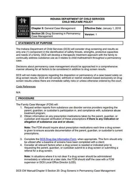 Outlines drug screening policies and procedures that may be carried out during the ongoing permanency phase of the case. The Indiana DCS developed a therapeutic treatment approach with the family to continually address substance use as it relates to child maltreatment throughout a permanency case.