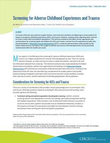 Treatment providers, behavioral health clinicians, and other healthcare professionals will learn trauma-informed screening approaches and considerations for both adults and children from this document. This technical tool also provides site-specific screening examples and the ACE questionnaire.
