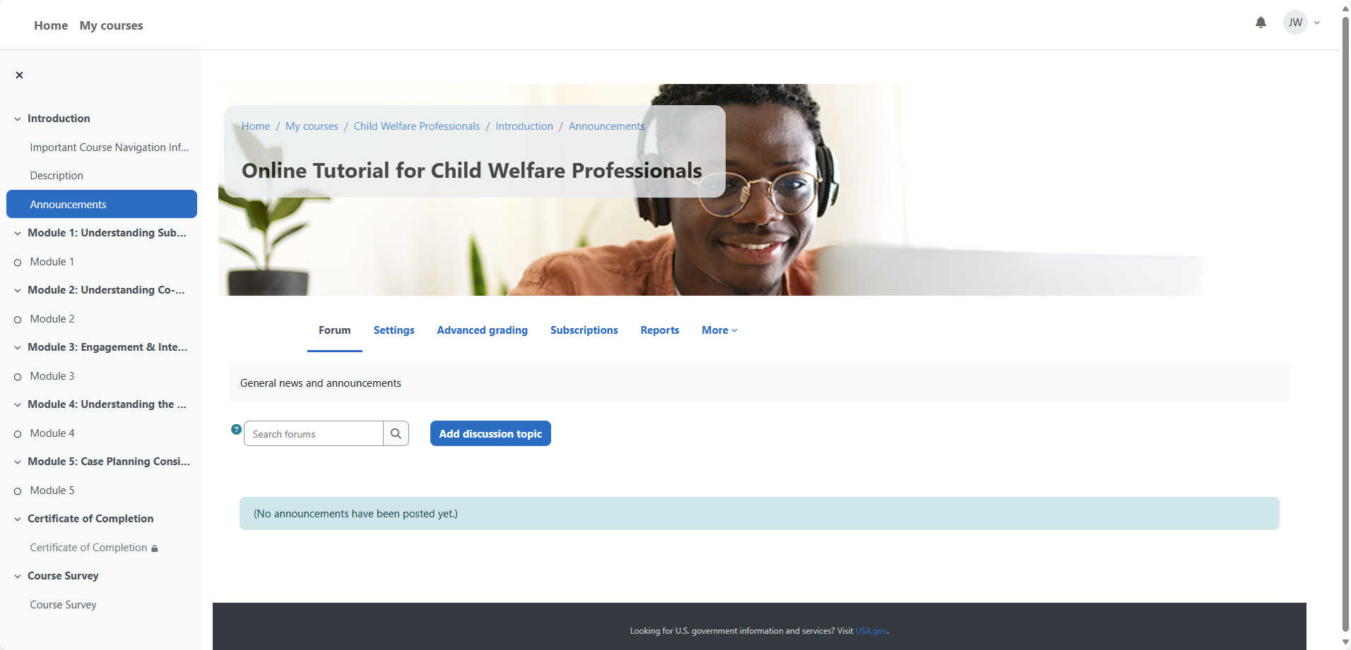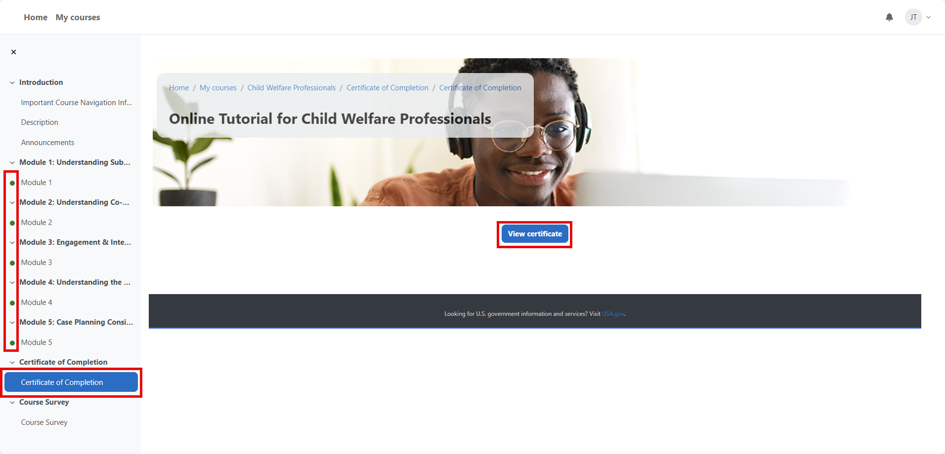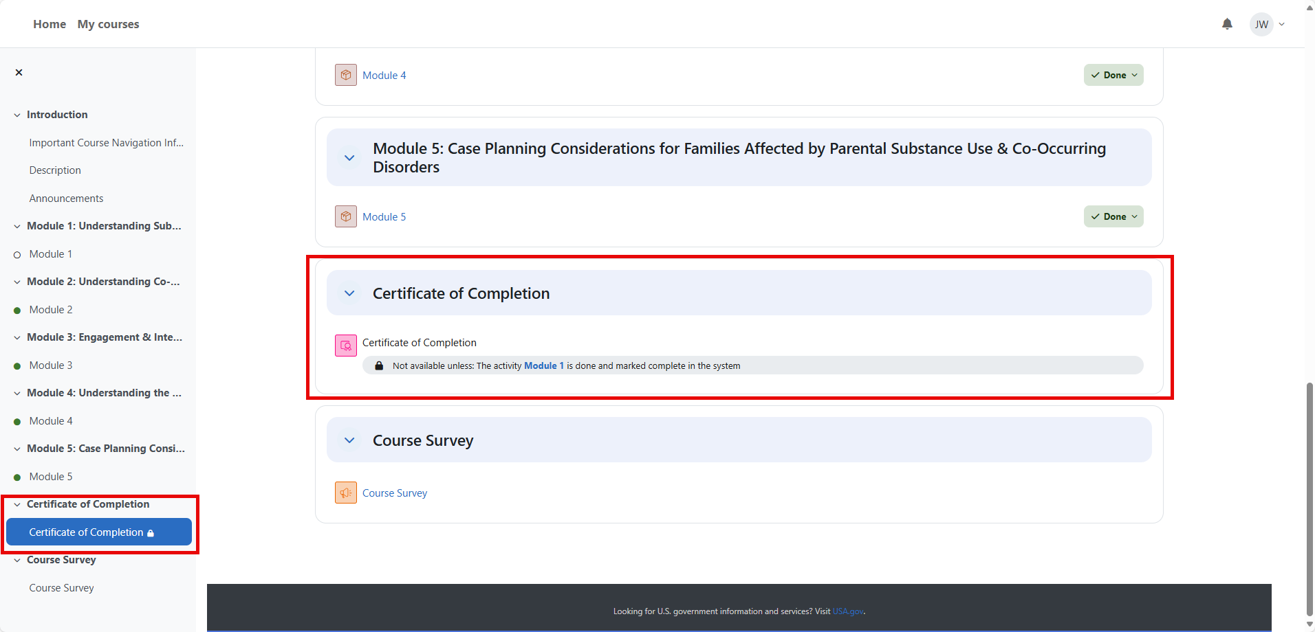 If a module within an Online Tutorial is updated before you complete it, your progress in that module will be reset, and you’ll need to start it over. NCSACW will publish announcements of upcoming updates so learners can plan accordingly. If you have not completed all modules within a course, the Certificate of Completion section will list which module(s) still need to be completed, making the certificate not available. The LMS will grant you access to the certificate of completion once all modules are marked as complete.