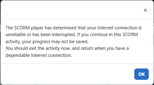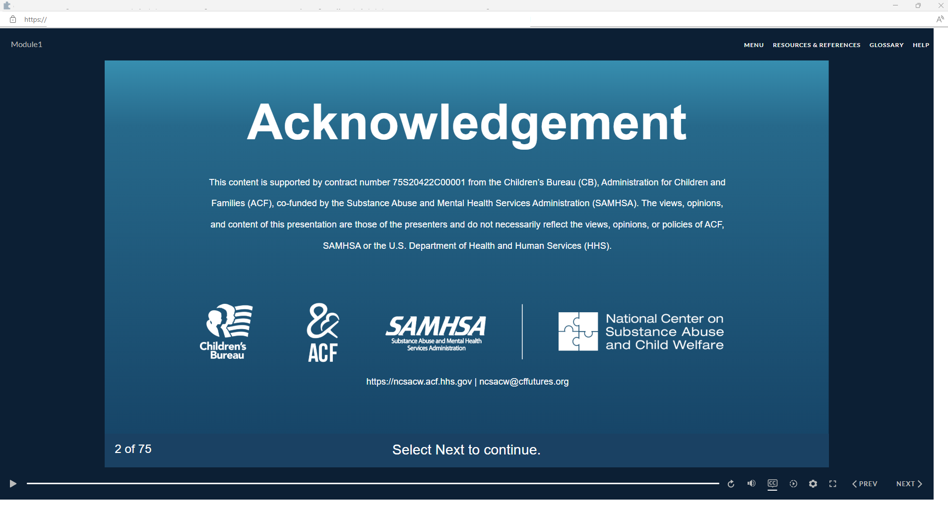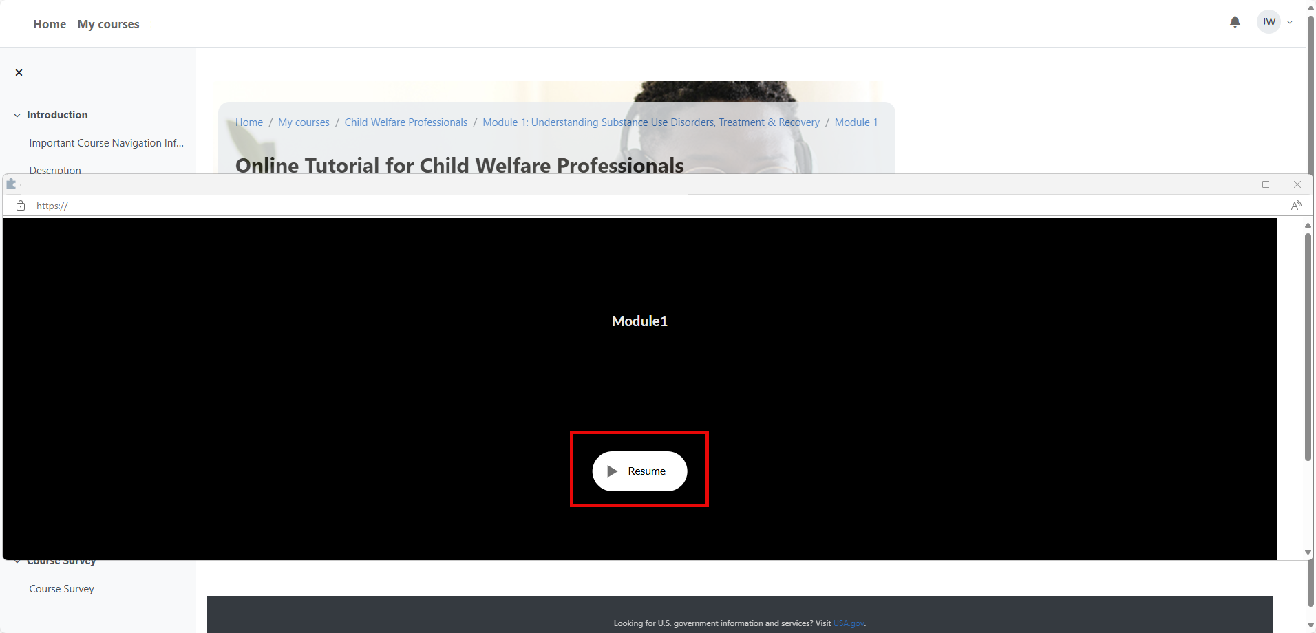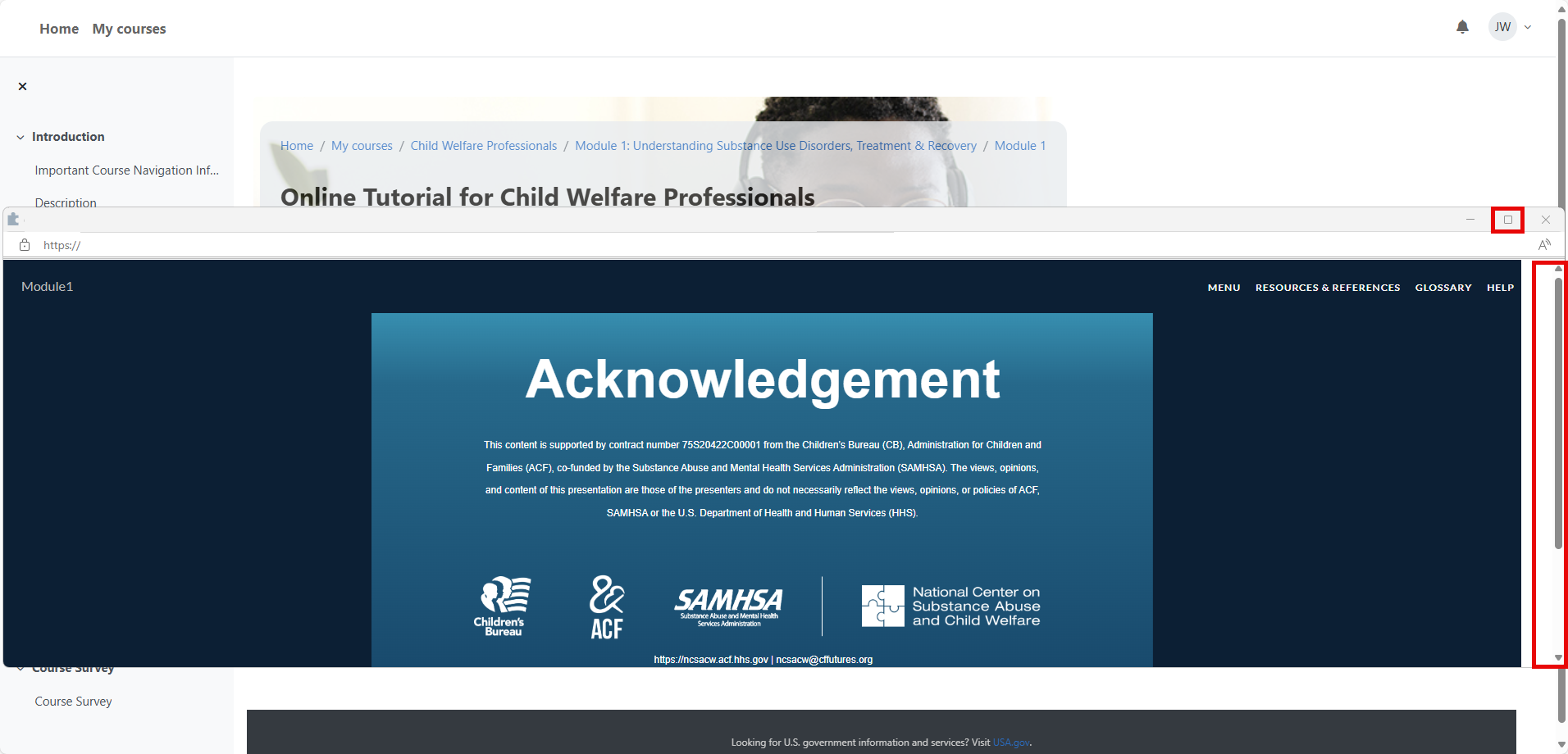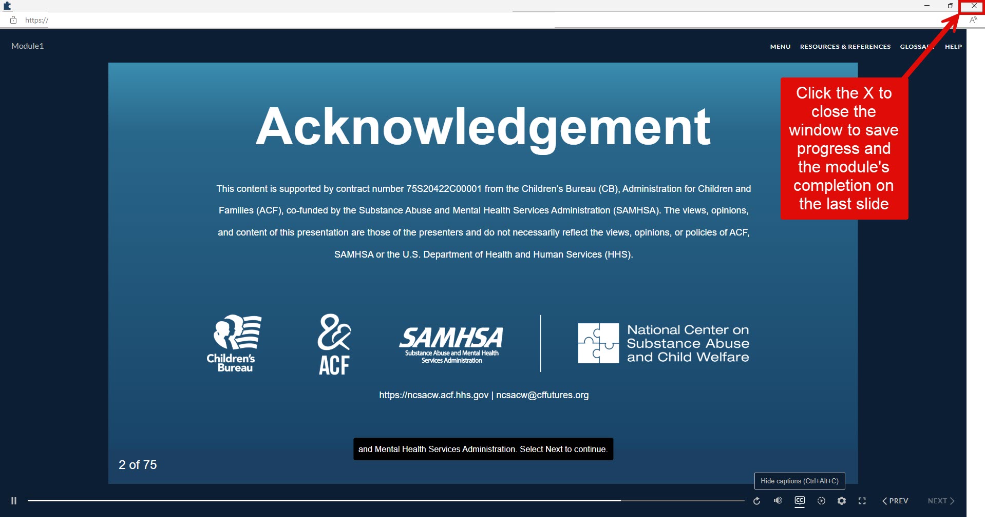 Make sure your device (e.g., computer, laptop, tablet, or phone) stays connected to the internet for the NCSACW Online Tutorials LMS to track your progress through each module. Close content window to ensure progress is saved to the LMS.