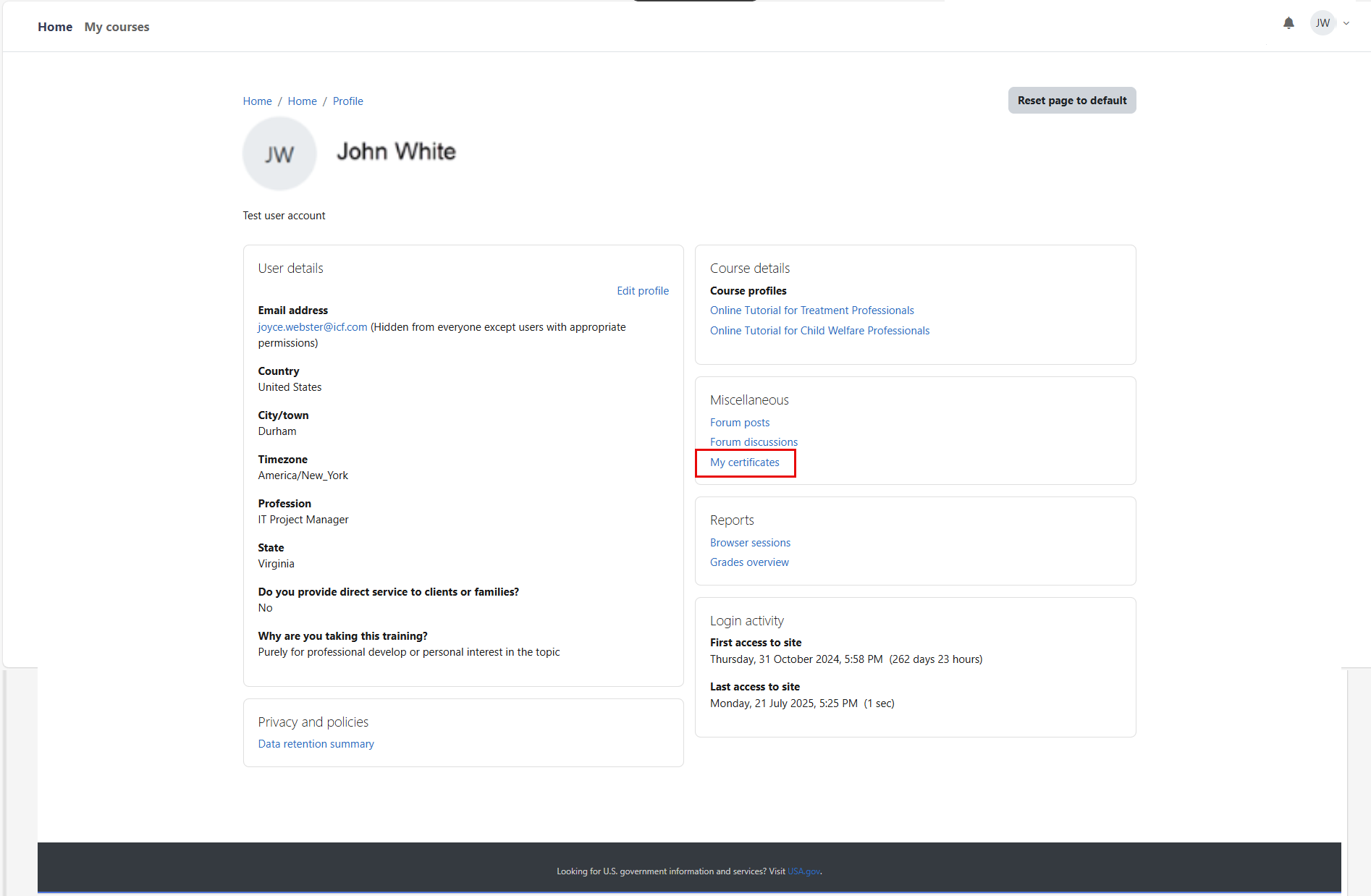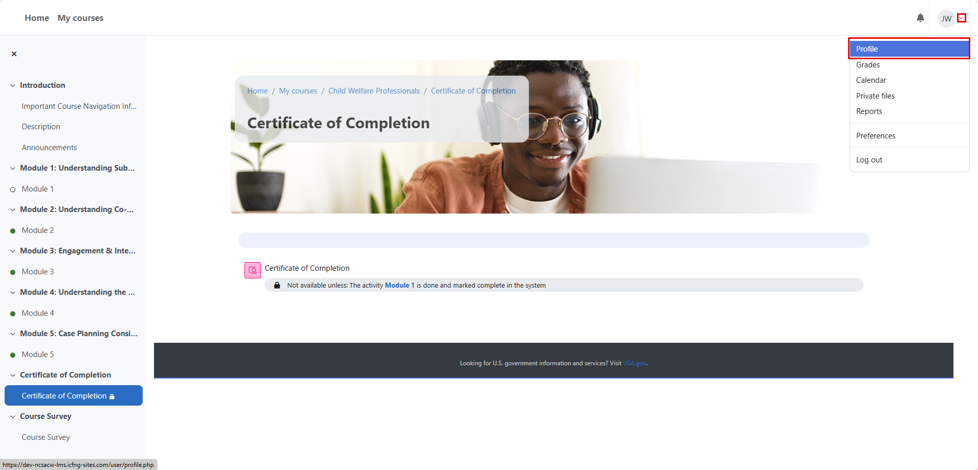 If you have completed all modules within a course and have been granted access to your certificate of completion when a module is updated, you can access the certificate of completion via your Profile. To access your Profile, select the down-arrow to the right of your initials in the top-right of the menu, then select “Profile.”