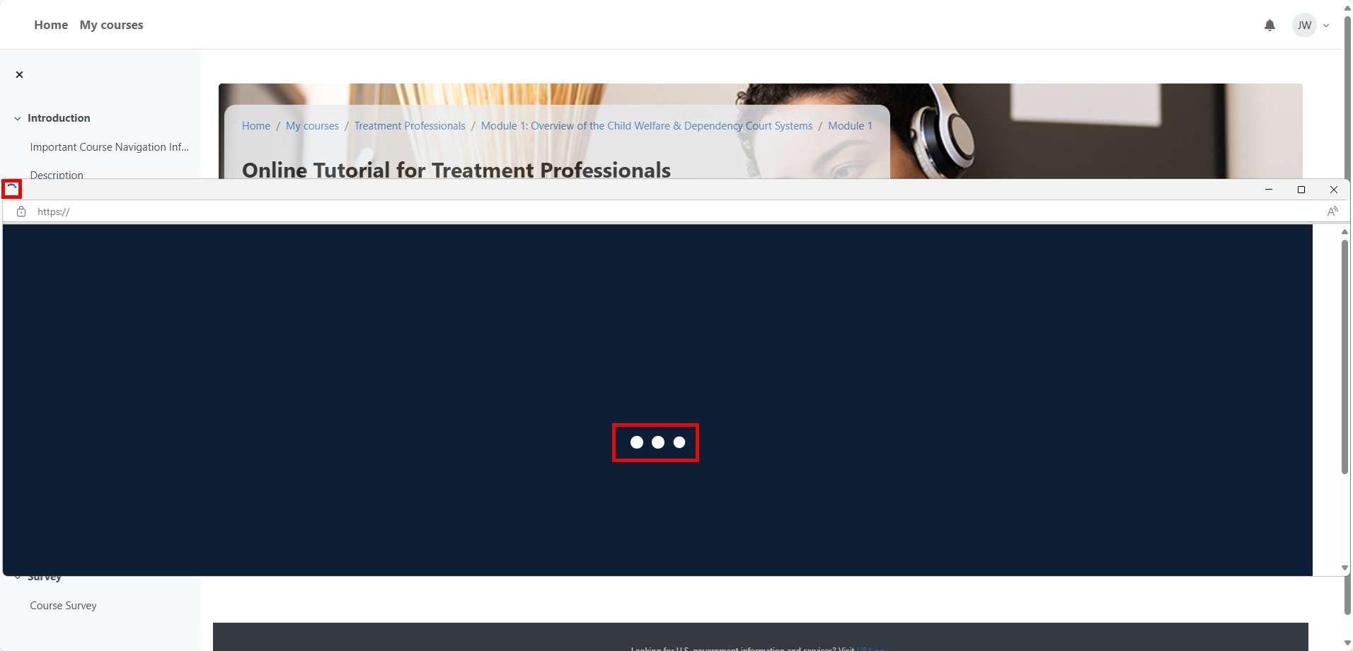 The course is designed to open in a new window. The modules are information-rich and may take a minute to load. The window will open with a gray then blue screen while the course content loads. Dots will appear and rotate in a circle in the top left of the window to indicate progress. The screen will turn dark blue. First, one dot will appear in the center, followed by two more dots. This indicates that the system is loading the course module.