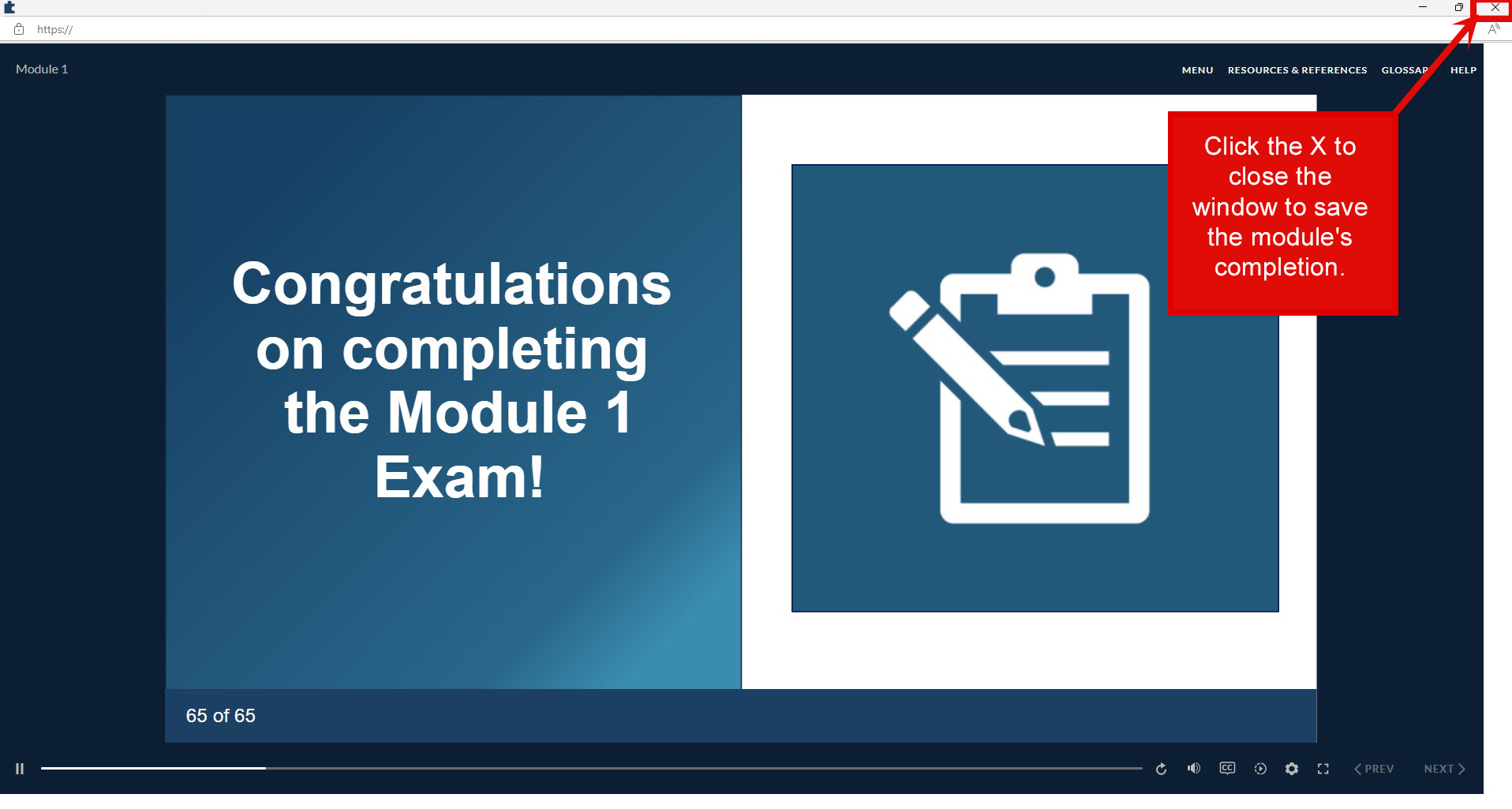 Once you have reached a stopping point or have completed the module, click the X in the top right of the screen to close the module window and return to the Online Tutorial page. This will close the module window and ensure your progress is captured in the LMS. You will be redirected to the Online Tutorial page where you may continue your training at any time.