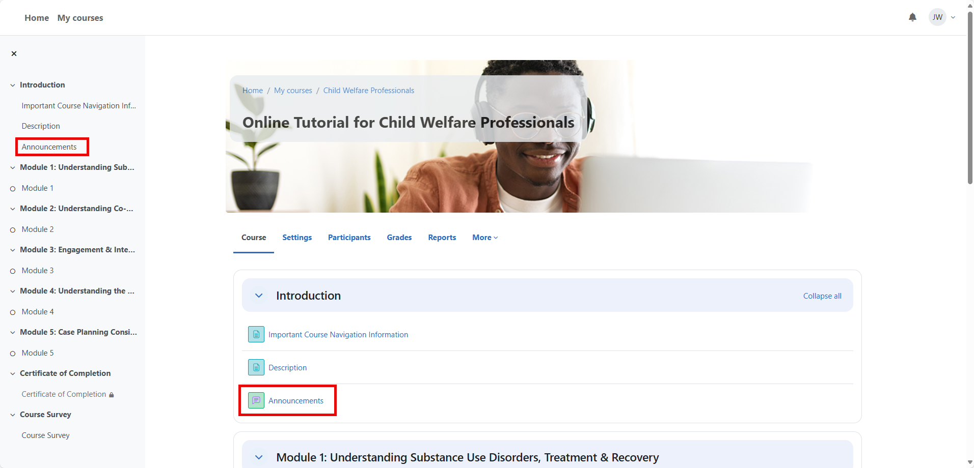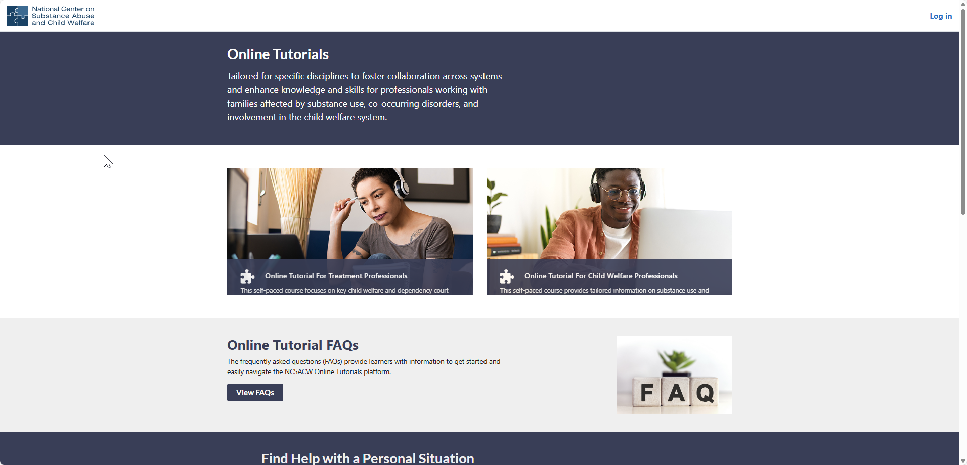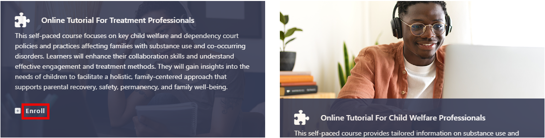 To enroll in an Online Tutorial, you’ll first need to create an account (see Account registration for instructions). The NCSACW Online Tutorials site lists various courses tailored for professionals in child welfare, treatment, and legal systems.