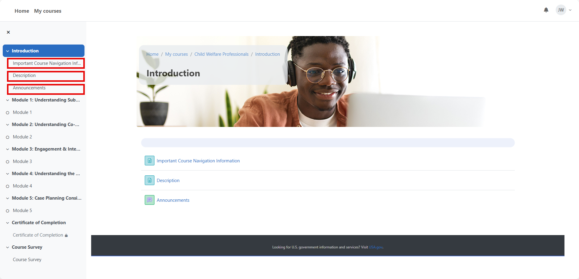Each course has an Introduction section that includes Important Course Navigation Information, Description, and Announcements, if any.