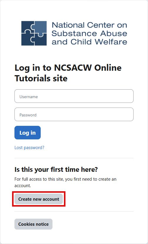 To register for a new account, select the Log in link in the top right of the window or hover over one of the Online Tutorial cards, then select the Enroll link. This will open the Log in to NCSACW Online Tutorials site form. Then select the “Create new account” button.