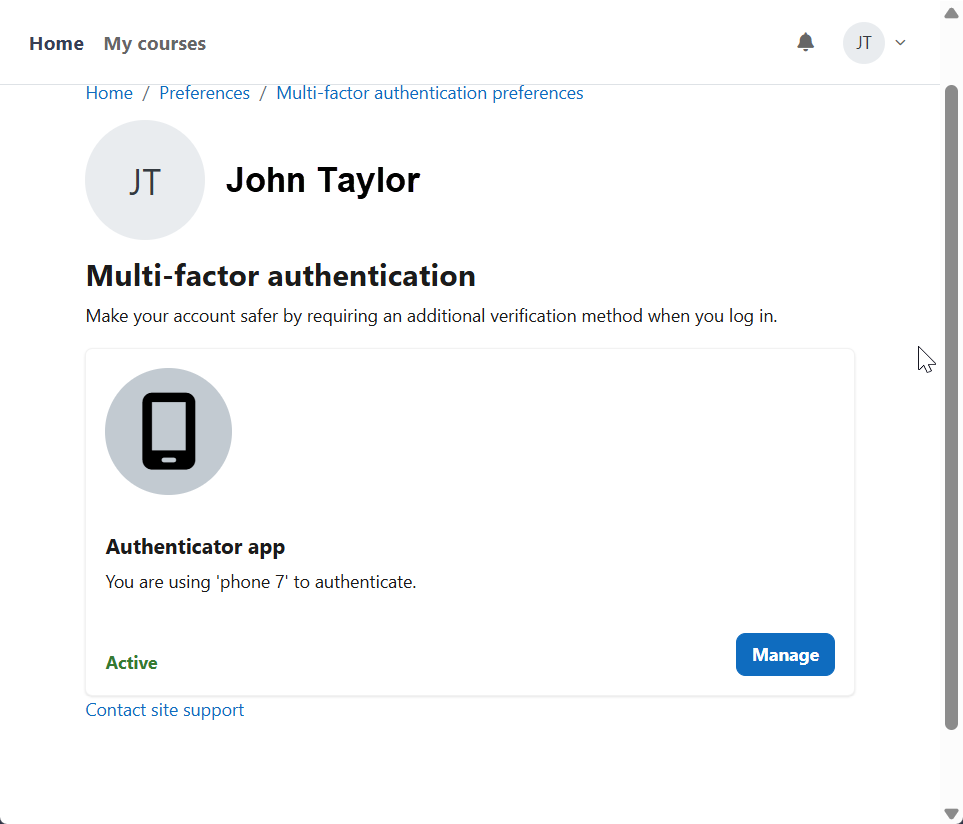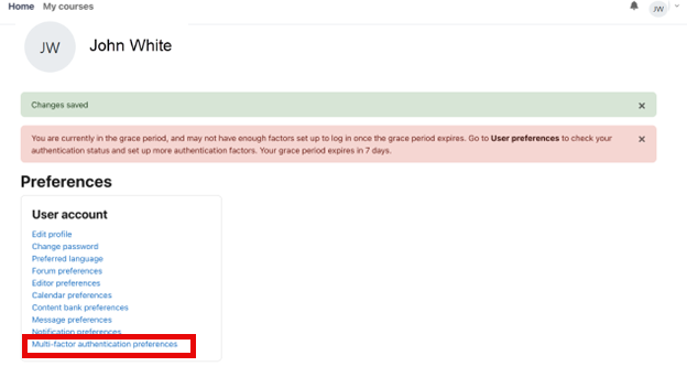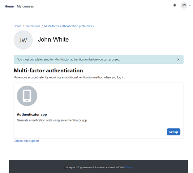 The NCSACW Online Tutorials site requires you to set up multi-factor authentication, or an MFA, after creating a new account. You can set up an MFA during the account creation process or skip the MFA setup for up to 1 hour. When you log into the NCSACW Online Tutorials site after the grace period ends, you are directed to set up an MFA before proceeding further. You will not be able to access the course until you set up an MFA. Select the “Multi-factor authentication preferences” link.