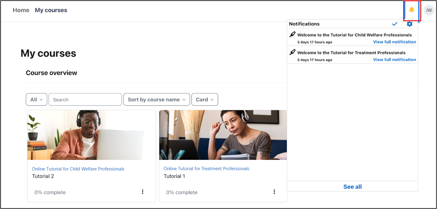 At the top of the page, you will notice a bell icon. This icon serves as your notifications center. When you click on the bell, a list of all your notifications will appear, allowing you to quickly view important updates or messages related to your courses and account activity.
