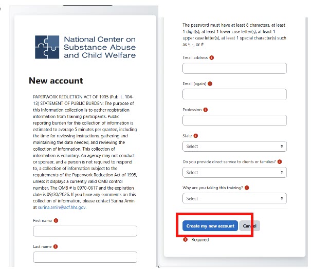All fields on the New Account form are required. After completing the form, select the “Create my new account” button.